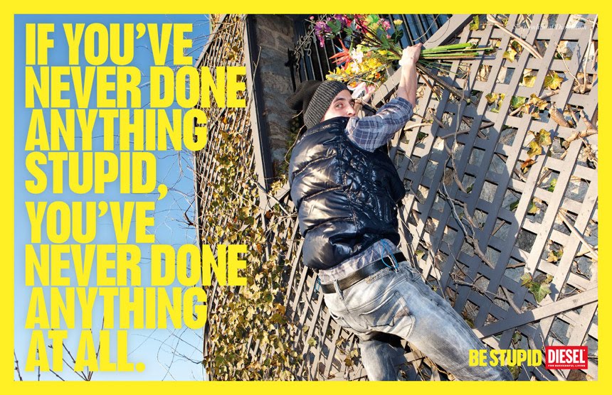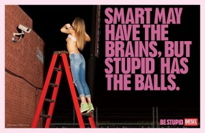 As long as I can remember, Diesel has produced sensual and edgy ads, featuring notably styalized photography. The world in those ads looked no more realistic than the airbrushed men and women they contained; however, in 2010 Diesel decided to create a series of ads with a brand new feel and look. The inspiration behind this bold move? Be Stupid.