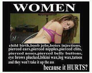 Kaycorbs444: Exactly! I feel like that’s the biggest problem I have with this image. In every scenario women are actively making the choice to do something, whether it be a new tattoo, or a new boob job. And whether or not people agree with plastic surgery/ cosmetic enhancement, the woman is receiving the result that she wants. However, when we look at this picture the suggestion is not that women want to participate in anal sex, but merely that they should just shut up and let the man penetrate her, because he really wants it, and she should be able to take a little bit of pain, if she can handle some of these other procedures. And in the end, it’s bullshit, because we all know that if one day we just happened to stop plucking our eyebrows or getting a bikini wax, men would have words for us!
