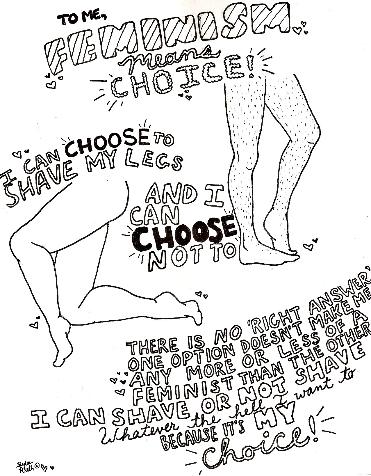 The list of examples goes on and on. My point is that yes, you can make the choice to be feminine, and embody the manicured, made-up, clean-shaved standards that come along with it. But lest we mistakenly think that that choice is a result of our purely unconstrained free will. I can claim to “incidentally” reaffirm certain qualities that align with my gender role, and while that doesn’t mean that I buy into patriarchal oppression, it is my responsibility to be aware of that privileged position. It’s important to consider that just maybe, on some level, a part of my choosing to shave my legs and wear makeup comes from the desire to avoid the discomfort that comes along with not doing these things. To an extent, we’re not totally exercising our own free will in “indulging” these desires…we’re being obedient.