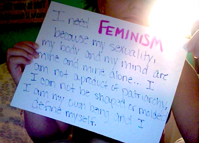 Knowledge is power and whoever came up with the whole “ignorance is bliss” mentality is an idiot, sorry but we cannot create change without an extensive knowledge of our oppression. We cannot fight patriarchy blindfolded, well you can’t really do anything blindfolded but all I’m saying that is without feminism we are ignorant to the patriarchal concept that women are seen as the “other” sex, vaginas are our anatomical dictators that provide a reason to get paid less, restricted to the private sphere and our worth lies in our reproductive ability. We are vessels for a man to use for his, and his alone, sexual desires then toss us to the side. Because of our slight genital differences we are told how to act, how to dress, there is only one type of beautiful, we must like sex but we can’t be too sexual because then you’re a slut, everything that men are praised for makes me look like a bitch and the fact that sexual assault is a fear in general. I could go on but you get the point but I honestly think that you have to see all the wires of the birdcage to even begin a rescue mission. I came across a tumblr site about needing feminism and people send in pictures of the reasons they need feminism which is amazing to see. The world needs feminism but I took a photo of why I need feminism…