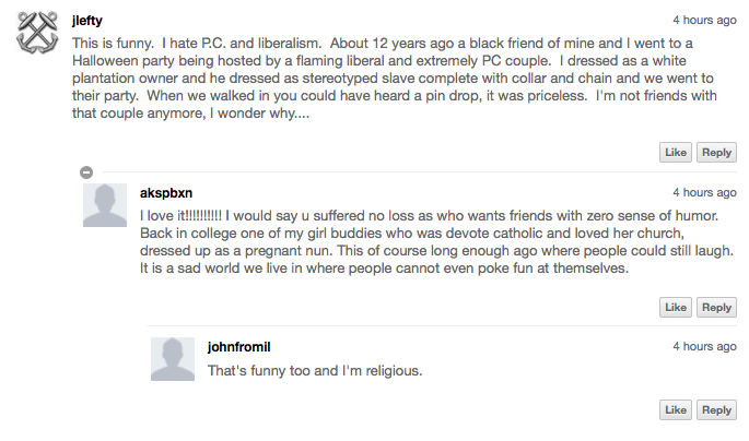 One doesn’t have to don a stereotype to have a good time, but embrace the fun! You won’t ruin Halloween for everyone if you can’t wear a culturally fueled costume, but one badly thought out costume can ruin Halloween for anyone associated with it. So when I read through the horrendous comments some of the people decided to express, I can’t help but wonder who’s behind the keyboard? Anybody else thinking it might be old, generational white privilege?