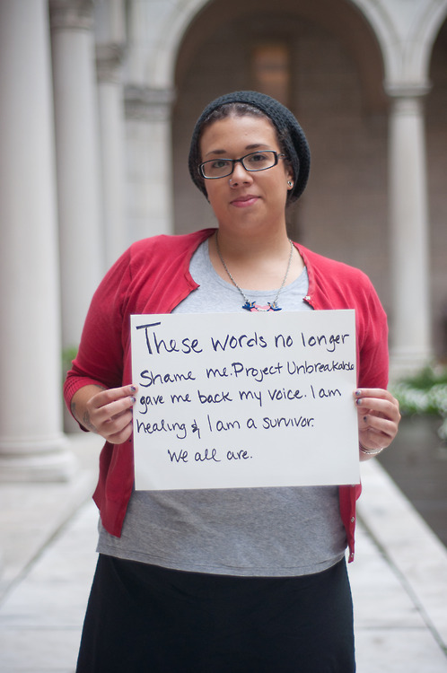 I have followed Project Unbreakable for what feels like a beautifully long time. The project was founded in october of 2011, and I must have found them just a few months later and followed their every move. I remember the project moving from being a photo project to a continued project, and Grace taking the project on the road and photographing survivors all over the country. I was excited when she traveled abroad, and wanted desperately to apply when she posted that she was hiring interns. I ordered their wristband, wore it proudly, and signed up for the newsletter in a giddy email to Kaelyn, the new Director of Project Unbreakable. (To which I received an equally excited response!) Needless to say, I was thrilled when I heard they were coming to speak at JMU.