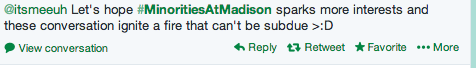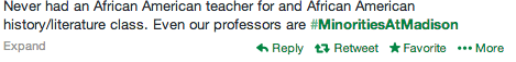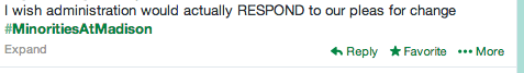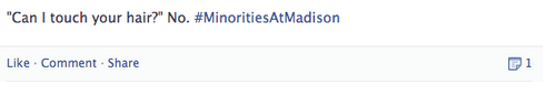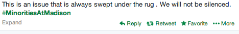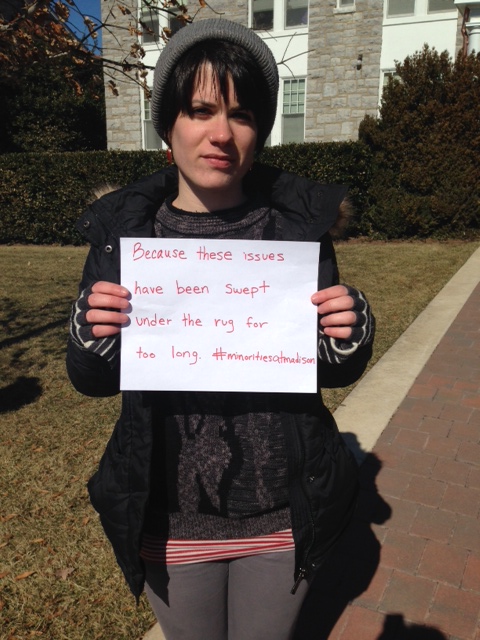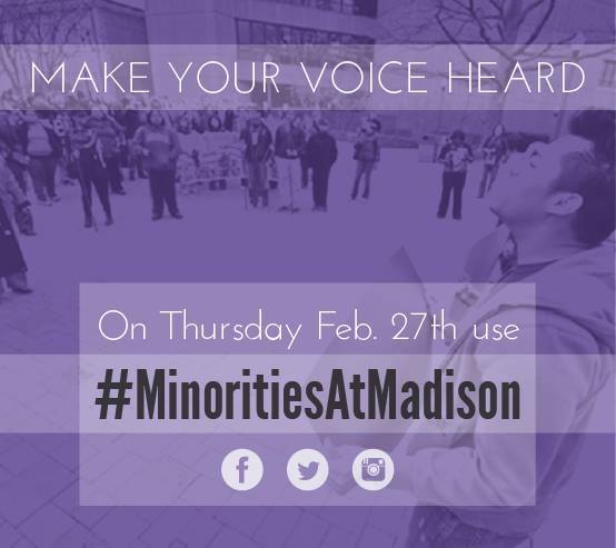 On Thursday, February 27th, students of color and allies spoke out about issues of race and diversity on campus. An online campaign was organized in which students used #MinoritiesAtMadison to start a dialogue about their experiences as minorities similar to the one started by black students at the University of Michigan. Facebook, Twitter and Instagram all functioned as forums for the conversation. Students shared everything from everyday microagressions in their dorms and classrooms to blatant instances of racism and discrimination. Many expressed a sense of frustration in trying to get peers to recognize their often unintentional yet harmful remarks.