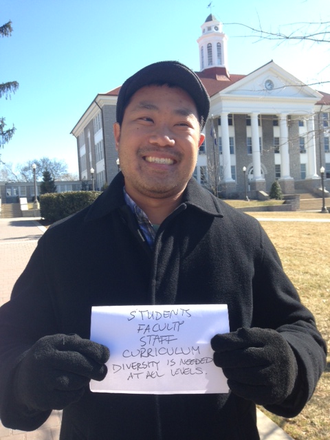 The online event coincided with a physical show of support for a freshman student named Jackie Horton who met with Vice President, Donna Harper about diversity issues yesterday. Faculty and students showed up outside of Alumnae Hall around 2:00 pm to demonstrate their support for a more diverse and inclusive JMU. Organizers put together a photo campaign in which people at the event shared why they supported diversity.