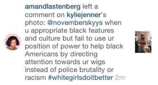 “when u appropriate black features and culture but fail to use ur position of power to help black Americans by directing attention towards ur wigs instead of police brutality or racism #whitegirlsdoitbetter.”