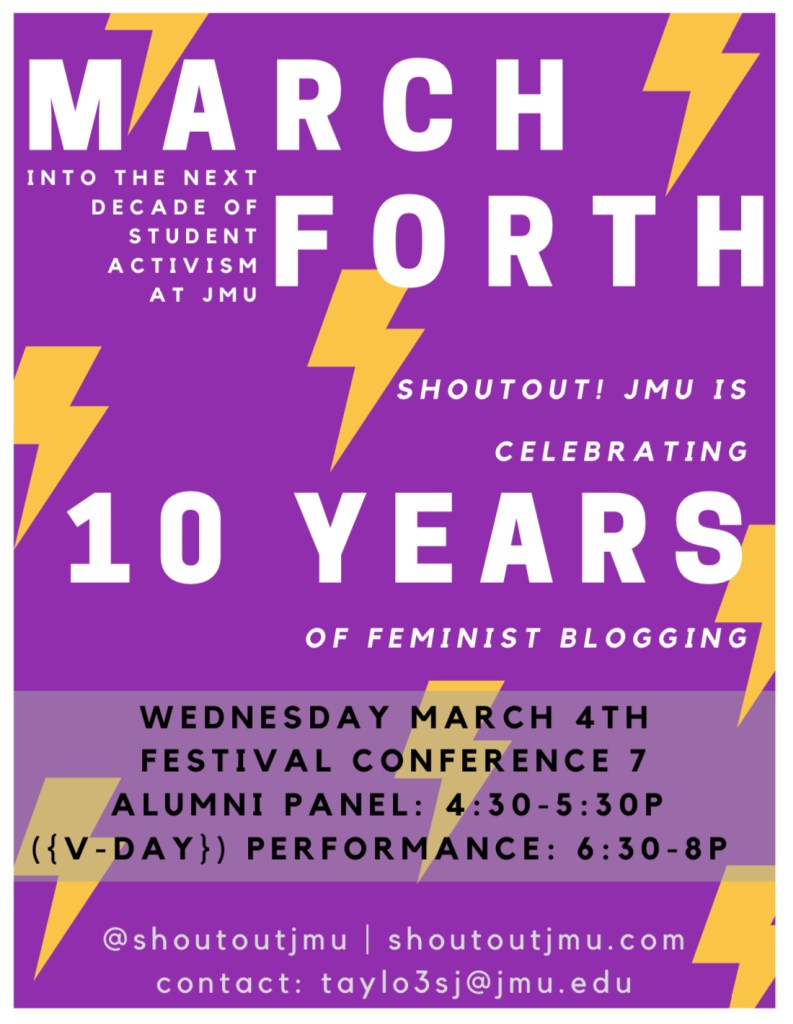Did you know that JMU’s oldest and only Feminist Blog is turning 10? ShoutOut JMU is ringing in a decade of student activism in the digital sphere, and we need your voice to help us celebrate this radical accomplishment. We are once again seeking out performers to join us for our annual V-DAY Event to take place on Wednesday, MARCH 4TH from 7-9 PM, to raise awareness and bring an end to violence against women, femmes, and non-binary folx.