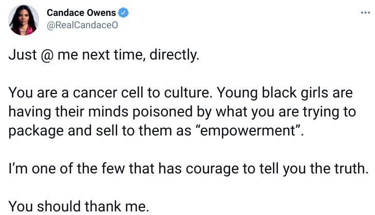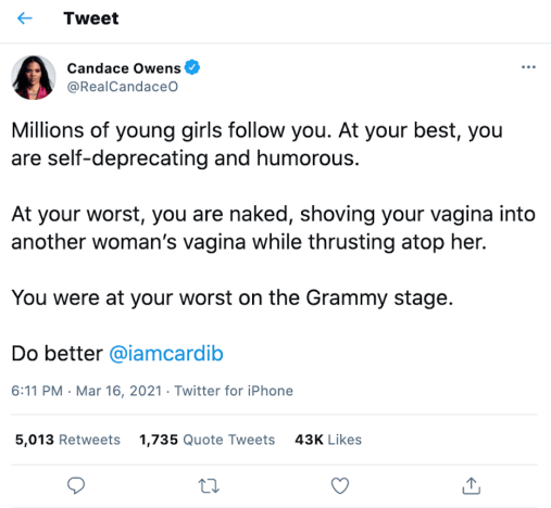 In the Big US (National): If you haven’t heard about Candace Owens Ridiculing Cardi B and Megan thee Stallions’ recent Grammy Performance, grab some popcorn and a stiff drink. After their performance,Candace Owens goes on Fox News and says “You see that fundamentally we are seeing the destruction of American values and American principles. And it’s terrifying!.. Parents should be terrified that this is the direction that our society is heading towards. Again, we are weakening America…. We are setting the stage, and it feels like we are looking at corrosion, like we are about to see the end of an empire.” After this Fox appearance, Cardi B tweets her response (see images below), a seemingly lighthearted response… and the rest was history, read some of Candace’s counter tweets below: