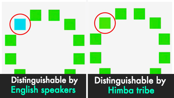 Because the Himba do not have a word for the color blue, blue appears to them as just another shade of green. In the example on the right, English speakers have trouble discerning the shade of green that is different from the rest while the members of the Himba tribe can easily pick it out– the Himba discourse is designed to discern different shades of green, while English speakers typically just use one word to refer to all shades.[1]