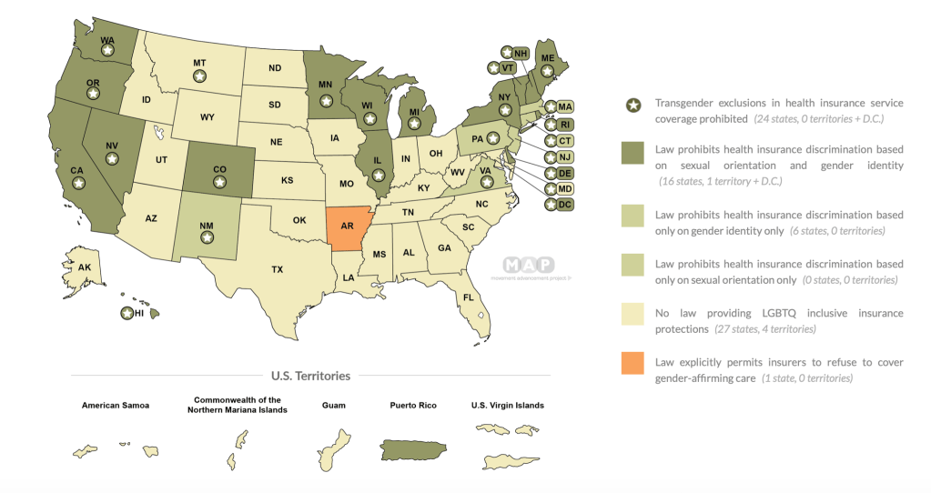 In an article by the Movement Advancement Project, the author shows that 24 states and D.C. prohibit Transgender exclusions in health insurance service coverage. (as seen in the map below) This is a great start to the equality needed in this country. We are almost half way to all of the states not discriminating based on gender identity! I know this is not something to be too excited about, since there should be no discrimination in the first place, but sometimes it is good to celebrate any win you can get, no matter if it is big or small.