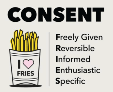 So, what is consent? There are many different aspects of consent when engaging in sexual activities. As seen in the graphic below, provided by SASV’s sexual assault and consent presentation, the acronym FRIES shows the different variations of consent. Freely given means that there was no coercion involved (i.e., “if you don’t have sex with me it means you don’t love me”). Next, consent can be reversed at any point during sexual activity if one party becomes uncomfortable or uninterested. Additionally, in order to consent, both parties must be fully informed on what they are consenting to. Consent cannot be anything less than an enthusiastic “yes”, silence does not mean yes, maybe is not yes, and I do not know is not yes. Lastly, consent must be specific. For example, someone can consent to kissing but that does NOT mean that they consented to any sexual activities. Consent must be given every step of the way.